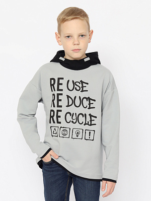 Джемпер с длинными рукавами, притачным поясом и манжетами. Манжеты и пояс выполнены из основного полотна. Горловина круглая с притачным воротником из полотна с добавлением лайкры. Перед и рукав декорированы принтом "Нарушай правила, будущее пренадлежит любознательным, юный и безбашенный, давай будем легендарными".