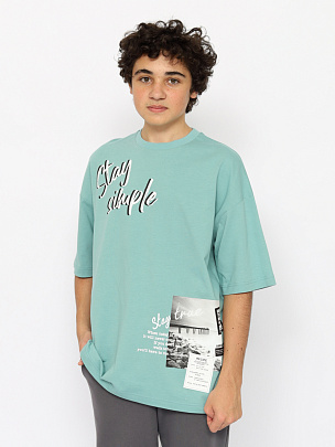 футболка со спущенным плечом из гладкой кулирки. горловина круглая, обработана притачной планкой из кашкорсе с эластаном. перед футболки декорирован принтом.