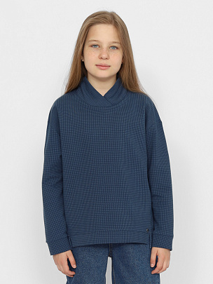 Джемпер свободного силуэта для девочки со спущенным плечом и длинными рукавами. Полочка декорированя кружевом. Воротник из основного полотна.