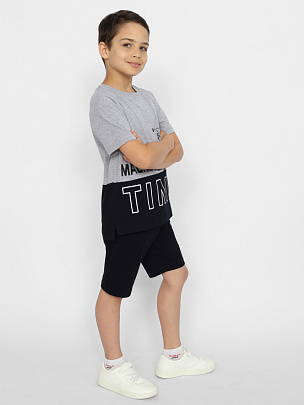 Комбинированная футболка с короткими рукавами. Горловина круглая, обработана узким воротником из полотна с эластаном. Перед футболки с горизонтальным швом чуть ниже линии груди. Перед футболки декорирован принтом "время машин". Шорты с боковыми карманами. Пояс притачной, с резинкой внутри и шнуром.