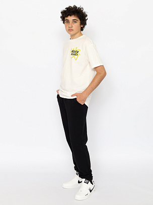 Прямая футболка для молодых мужчин с короткими рукавами. Горловина круглая, оформлена эластичным воротником. Футболка выполнена из кулирки повышенной плотности. Перед и спинка футболки декориованы принтом "никогда не сожалей", "привет", "пока".